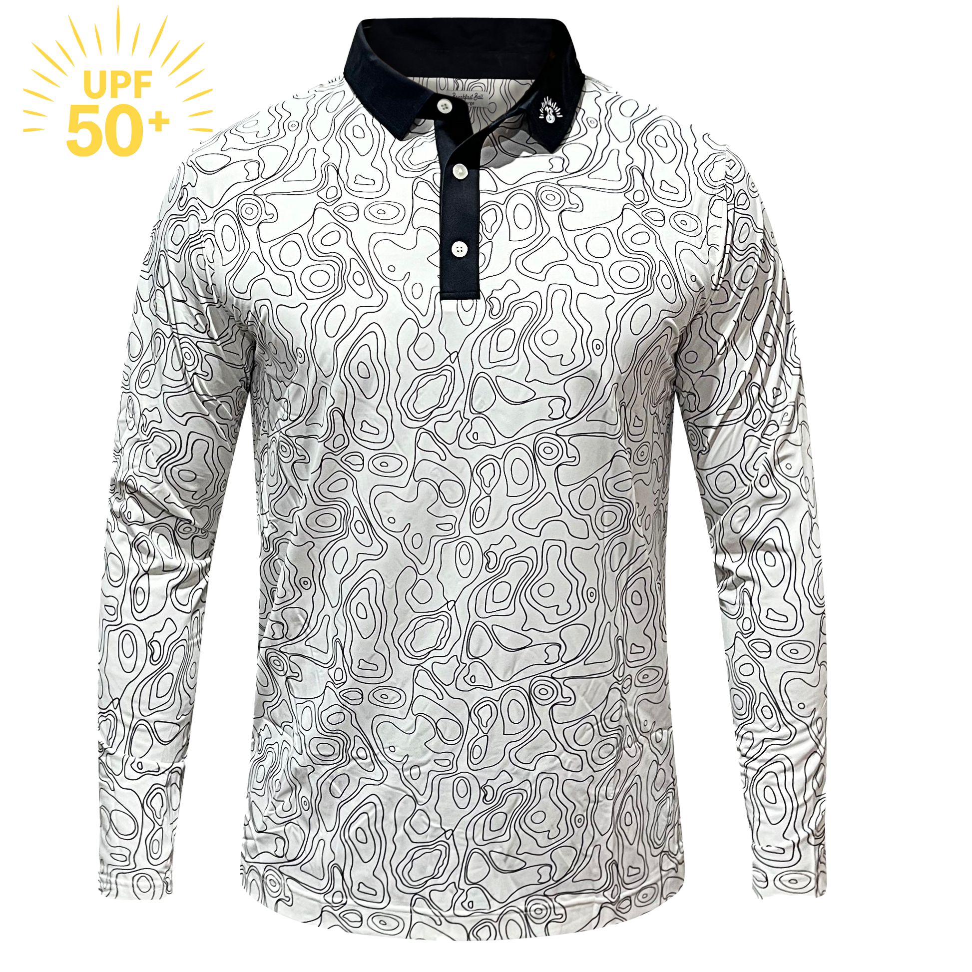 The Levels Long Sleeve Golf Shirt is a clean, confident choice for golfers who want sun safety and athletic edge in one. With a relaxed fit and soft 90% polyester / 10% spandex fabric, it delivers breathable stretch and all-day comfort. Certified UPF 50+ under AS 4399:2020, it protects your skin from harsh UV rays while wicking sweat and drying fast. Finished with a black collar and subtle topographic print, Levels brings understated detail to your course-day essentials.